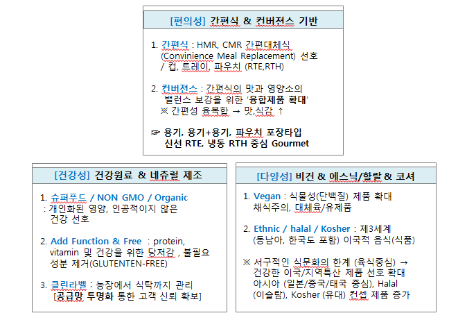 현재 식품 트렌드는 간편식의 증가로 포장형태의 진화되고 있고 (병 → 캔 → 용기 → 파우치) 건강을 중요시하는 원료나 농장에서 식탁까지 믿을 수 있는 제품(공정성, 신뢰)이 증가하고 있다