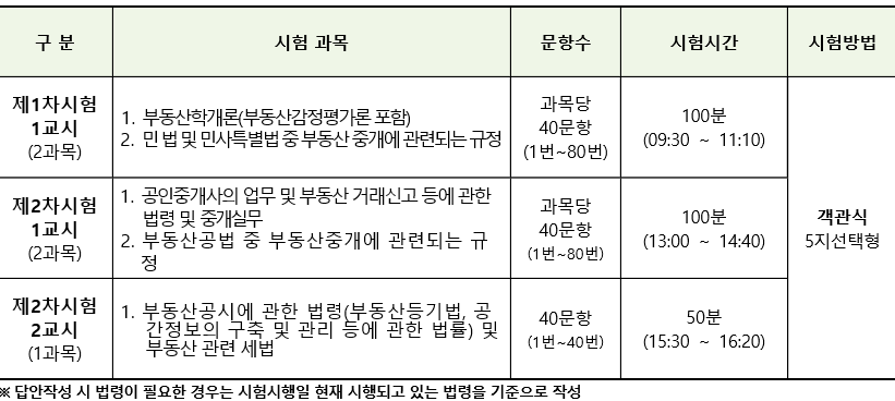 - 응시자격은 제한이 없습니다. 하지만 「 ① 공인중개사법 제4조3에 따라 시험부정행위로 처분 받은 날로부터 시험시행일 전일까지 5년이 경과되지 않은 자 ② 제6조에 따라 자격이 취소된 후 3년이 경과하지 않은 자 ③ 시행규칙 제2조에 따른 기자격취득자」는 응시할 수 없는 없습니다.