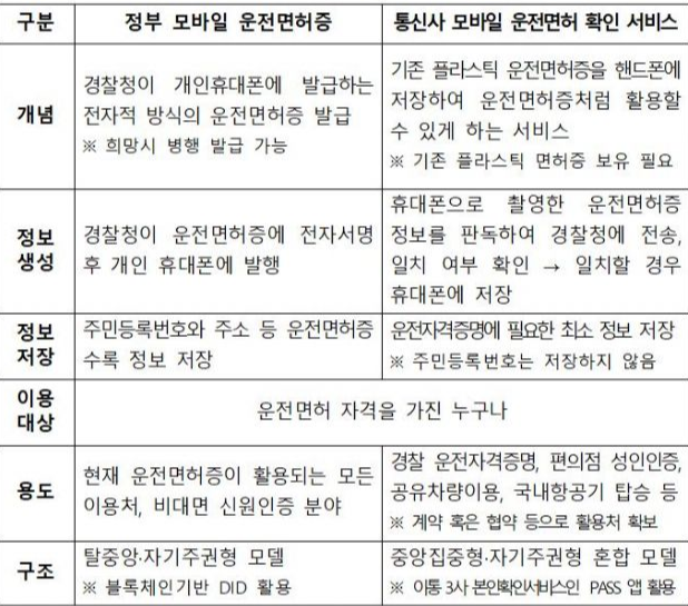 행정안정부는 디지털 전면 전환을 목표로 추진하는 '디지털 정부혁신 발전계획'의 일환으로 모바일 운전면허증을 내년에 상용화하기로 했습니다. 이에 모바일 운전면허증은 24일 출시되는 이동통신사 본인인증 앱 '패스' 기반의 모바일 운전면허증과 상당한 차이점을 갖고 있습니다. 같은 모바일 운전면허증이지만 그 쓰임새가 대폭 확대된다는 점에서 적지 않은 관심을 끌고 있습니다. 정부 설명에 따르면 패스 앱 기반의 운전면허증 서비스는 사용처에 제약이 있고 이통사는 운전면허증 발급 주체가 아니지만, 본인확인기관 자격을 갖고 있으므로 이를 활용해 본인확인을 거쳐 등록된 운전면허 정보를 불러올 수 있습니다.