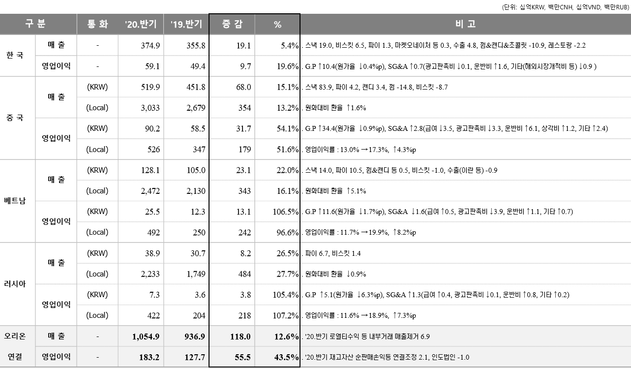 매출액 10,549억으로 전년비 +12.6% 증가하였습니다 나라별로 한국 3,749억 +5.4%, 중국 5,199억 +15.1%, 베트남 1,281억 +22.0%, 러시아 389억 +26.5% 각각 증가하였습니다. 특이한 점은 한국, 중국, 베트남은 스낵 중심으로 성장하였으나 러시아는 초코파이가 +67억(전체 성장액 82억)로 전체 성장액의 대부분을 차지하고 있습니다. 감소한 제품으로 껌, 캔디, 초콜릿 중심으로 한국과 중국 중심으로 감소하였습니다, 껌과 캔디는 지속적으로 감소하고 있으며 초콜렛은 코로나 19 로 발렌타인데이, 화이트데이 및 연말/연초의 졸업, 입학으로 특수가 없어지면서 감소된 것으로 파악됩니다.