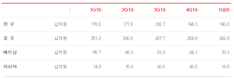 영업이익은 1,1832억으로 전년비 +555억(한국 +97억, 중국 317억, 베트남 131억, 러시아 38억), 43.5% 개선되었습니다. 특히 중국 317억 +54.1% 개선이 눈이 띕니다.