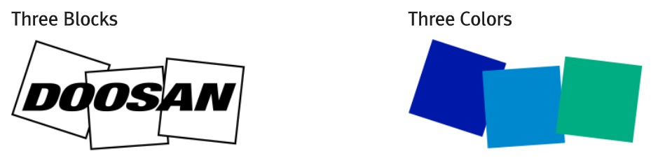 - Three Blocks : 세 개의 블록은 두산이 헌신하고자 하는 ‘사람’을 나타내며, 이는 곧 직원, 고객 및 파트너, 인류를 의미합니다. 세 개 블록의 기울기를 달리함으로써 두산의 역동성과 끊임없이 전진하는 모습을 상징합니다.