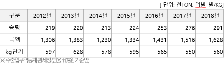 중국산 김치 수입 동향은 2018년 291천톤 전년 대비 5.4% 증가되면서 매년 5~10% 지속적으로 증가되었습니다. 특히 B2B 경로 유통되며서 위협적 가격대로 납품되고 있습니다. 예상 원가 760원/KG [수입원가 560원/KG + 200원/KG(관세20% + 부대비용)]이며, B2B 경로 1,000원 ~ 1,300원 경쟁력 있는 단가로 납품되고 있습니다.
