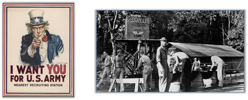 제2차 세계대전때 미국을 대표 하는 “uncle sam”이라는 가상인물이 “uncle spam”으로 불러지고, 하나의 남태평양 군사캠프가 “spam ville”으로 불러질 정도로 스팸은 미국 문화에 크게 자리잡게 되었습니다.