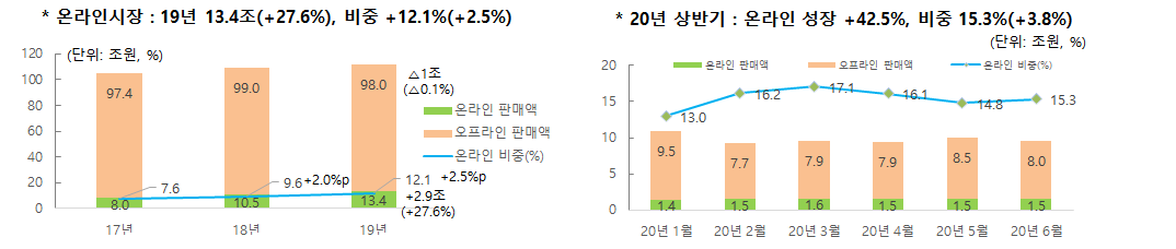 특히, 온라인 시장 규모는 '19년 13.4조 +27.6% 성장하였고 ’20’ 20년 상반기는 코로나 시대 언텍트 소비 증가로 +42.5% 성장하였습니다. 특히 채널 비중 10.5%(’18년) → 13.4%(’19년 )→ 15.3%(’20년上15.3%(’ 20년上,+3.8% p) 증가하게 됩니다.