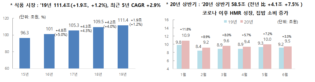 그 속에서 한국 식품시장 규모는 ‘19년 판매액 111.4조, 최근 5개년 CAGR+2.9% 지속적 안정적으로 성장하고 있습니다. 하지만 올해 2월 코로나-19 이슈로 인하여 온라인 채널 중심으로 집밥과 HMR 중심 '20년 상반기 58.5조 +7.5%로 성장률이 3배로 증가하게 됩니다.