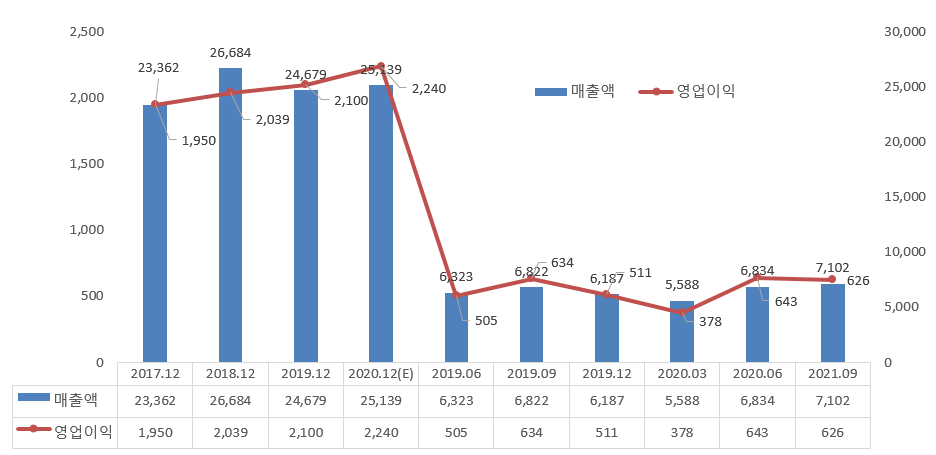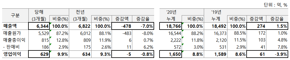 20년 9월 누계 손익 현황은 매출액 18,766억 +276억 +1.5% 소폭 상승하였고 영업이익은 1,650억(영업이익률 8.8%) +61억 소폭 개선하였다. 유가 하락으로 원가는 소폭 하락하였으나 매출 감소 및 판관비가 증가하였다.