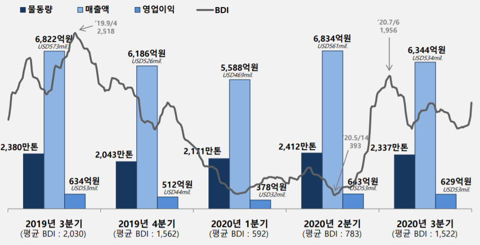 전년 동기 대비 Dry Bulk 시황 약 25% 하락에도 불구, 신규 CVC 투입으로 영업이익 동일 수준 달성한다. 단, 매출액은 물동량 소폭 감소 및 유가 하락으로 약 7% 하락 운임원가 하락한다. (Platt’s Singapore 기준 ‘19. 3Q HSFO 평균 : $430.9 vs ‘20. 3Q VLSFO 평균 $333.2, HSFO 평균 $269.2)