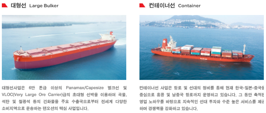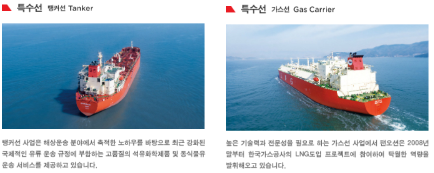 - 팬오션은 주력사업인 건화물 서비스를 필두로 컨테이너, 탱커 분야와 신규 진출한 LNG 운송에 이르기까지 다양 한 해상운송 서비스를 제공하고 있다.