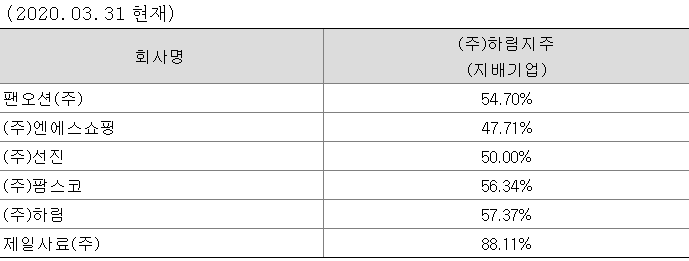 하림은 독점규제 및 공정거래에 관한 법률 제2조2.3 및 동법 시행령 제3조에 의거 2020년 분기보고서 기준일 현재 현재 당사를 포함하여 총92(국내 53개, 해외 39개)의 계열회사가 있습니다.