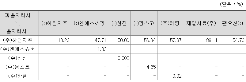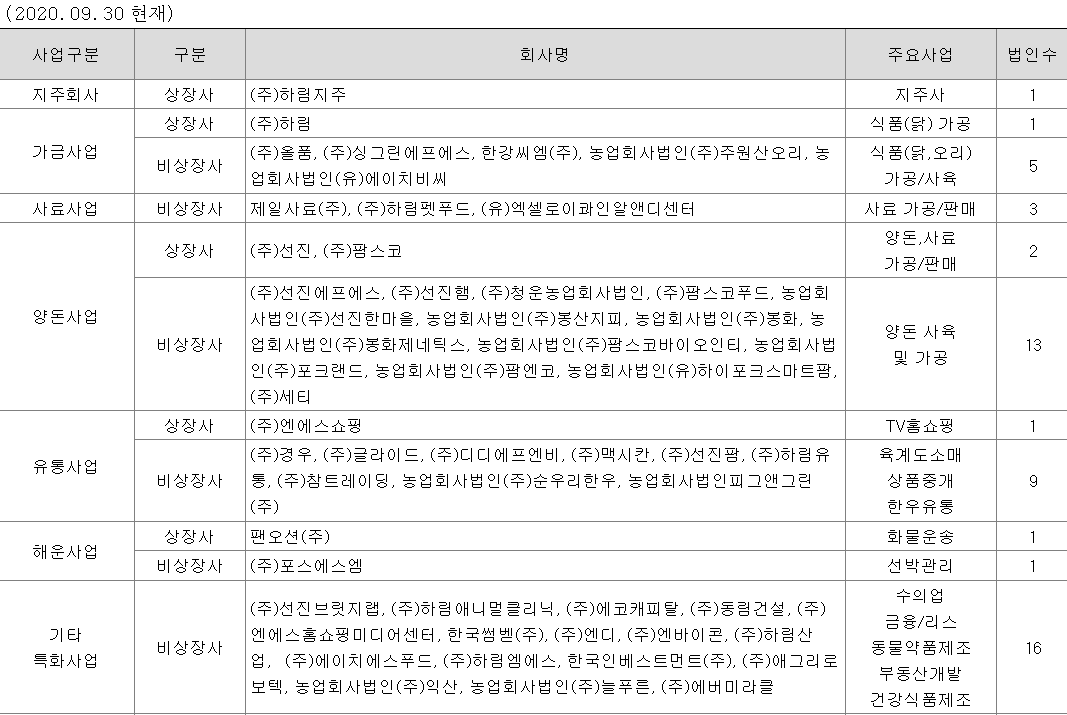 (주)하림이 속해 있는 기업집단은 그 성격에 있어서 크게 지주회사, 가금(닭, 오리)사업, 사료사업, 양돈/사료사업, 유통사업, 해운사업, 기타특화사업부문의 기업으로 대별되며, 당사 및 (주)하림지주, (주)선진, (주)팜스코, (주)엔에스쇼핑, 팬오션(주)을 제외한 모든 계열회사는 비상장사입니다. 진짜 많은 계열사로 가지고 있습니다.