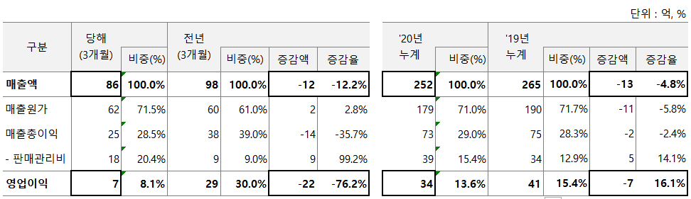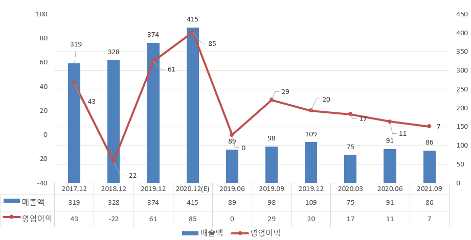9월 누계 매출액은 252억 전년비 -13억, -4.8% 역성장을 했으며 영업이익은 34억 전년비 -7억 손실을 보았습니다. 하지만 '20년 연간 매출액 예상은 415억 +41억, +9.1% 성장을 기대하고 있으며 영업이익 역시 85억 +24억 개선을 할 것으로 예상하고 있습니다. 영업이익액 주요 감소 원인은 매출 요인 -3.6억, GP개선 1.8억 개선, 판관비 +5억 증가가 원인입니다.