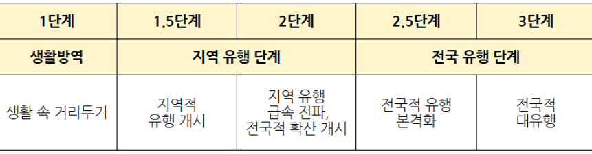 사회적 거리두기는 2020년 11월 1일 정부는 코로나19의 장기화에 따라 지속 가능한 방역체계가 이뤄져야 한다는 판단에 따라 3단계에서 5단계(1.5단계, 2.5단계 신설)로 세분화하는 내용의 사회적 거리두기 개편안을 발표했으며, 이는 11월 7일부터 적용되었습니다.