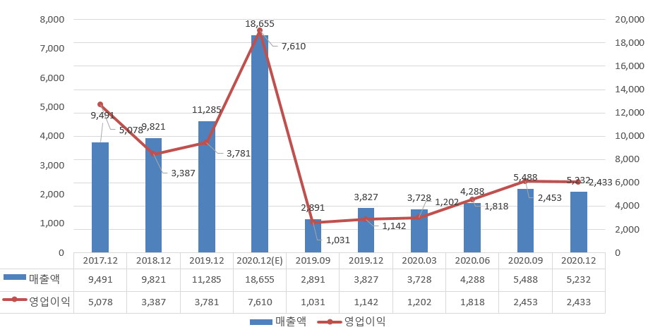 셀트리온의 기업 성과손익을 보면 매출액 18,655억 전년비 +7,370억 +65.3% 급성장하였고 영업이익은 7,610억으로 전년비 +3,829억 +101.3% 개선, 영업이익율이 +40.7% 역대급 성과를 올리고 있다.
