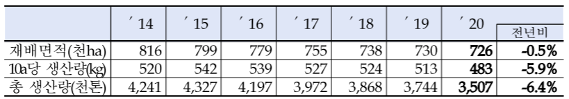 지역별 생산량은 전남(688천 톤), 충남(678천 톤), 전북(556천 톤) 순이며, 생산량 감소폭은 강원(△15.6%), 전북(△8.1%), 충북(△7.6%) 등이 크게 나타났다.