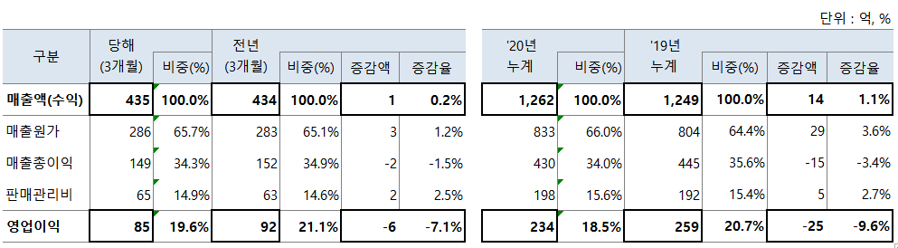'20년 9월 누계 1,262억으로 전년비 +14억 +1.1% 성장하였으나 영업이익은 234억 전년비 -25억 감소하였습니다. 코로나 영향으로 매출이 성장 못하면서 판관비(물류비, 감가상각비) +5억 증가을 상쇄하지 못하였고 매출원가 상승으로 매출이익액 +16억 증가하였습니다. 하지만 중요한 것은 영업이익률이 +18.5%로 지속적으로 20%를 유지하고 있다는 것입니다.