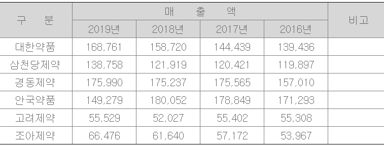 주요 이슈사항 ① 코로나로 인한 입원환자 감소로 수액제품 매출 성장이 둔화되면서 수익성 영향. ② 대한약품은 수액제품 매출이 전체의 80%로 차지로 수액 의존도가 실적 악영향 우려 ③ 15년 연속 매출 성장 및 수익 개선 발목 ④ 내수 위주의 수액 의존도가 높은 기업