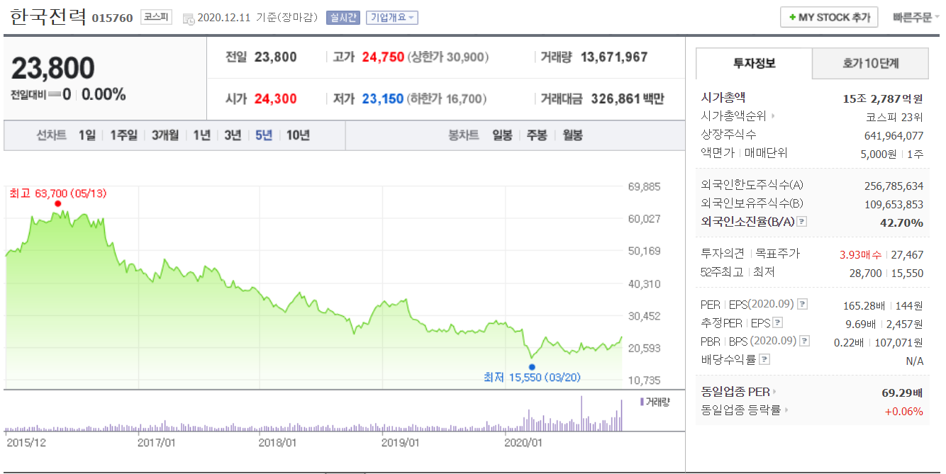 한국전력의 부채율은 186%, 당좌비율 48%로 재무구조는 안정적입니다. PER 9.98, PBR 0.22로 올해 영업이익 개선으로 주가 개선이 될 가능성이 높아졌습니다. 3년 전 영업이익 4조 9532억 일 때 주가는 4만 원 중반에서 4년 전에는 6만 원대 진행되었습니다. 그럼 내년에는 영업이익과 이슈만 있다면 한국전력의 주가는 4~6만 원까지 상승할 것으로 판단됩니다.