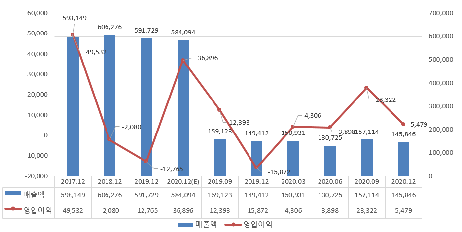 2020년 9월 누계 매출액은 43조 8,770억으로 전년비 -3,546억 -0.8% 역성장하였습니다. 주요 매출 내역은 전략판매 42조 3689억으로 대부분을 차지하고 있습니다. 영업이익은 3조 1526억으로 전년비 +2조 8418억 914% 개선하였습니다. 저유가, 유연탄 단가 하락, 원화강세, 원전 가동률 정상화 등으로 내년까지 이익이 개선되는 사이클 지속될 것으로 판단됩니다.