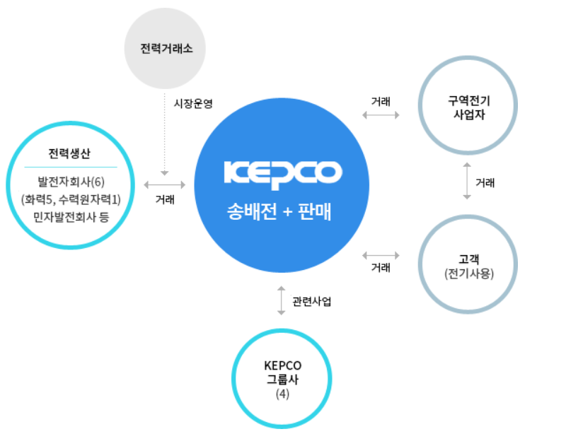 2011년부터 당사가 도입한 K-IFRS에 따라 연결대상 종속회사에 포함된 회사들이 영위하는 사업으로는 원자력발전사업[한국 수력원자력(주)], 화력발전사업[한국남동발전(주), 한국 중부발전(주), 한국 서부발전(주), 한국 남부발전(주), 한국동서발전(주)], 그리고 기타 사업으로 발전소 설계[한국전력기술(주)], 전력설비 정비[한전 KPS(주)], 전력 ICT 서비스[한전KDN(주)], 원자력연료가공[한전원자력연료(주)], 해외 전력사업 및 관련 투자사업 등이 있습니다.