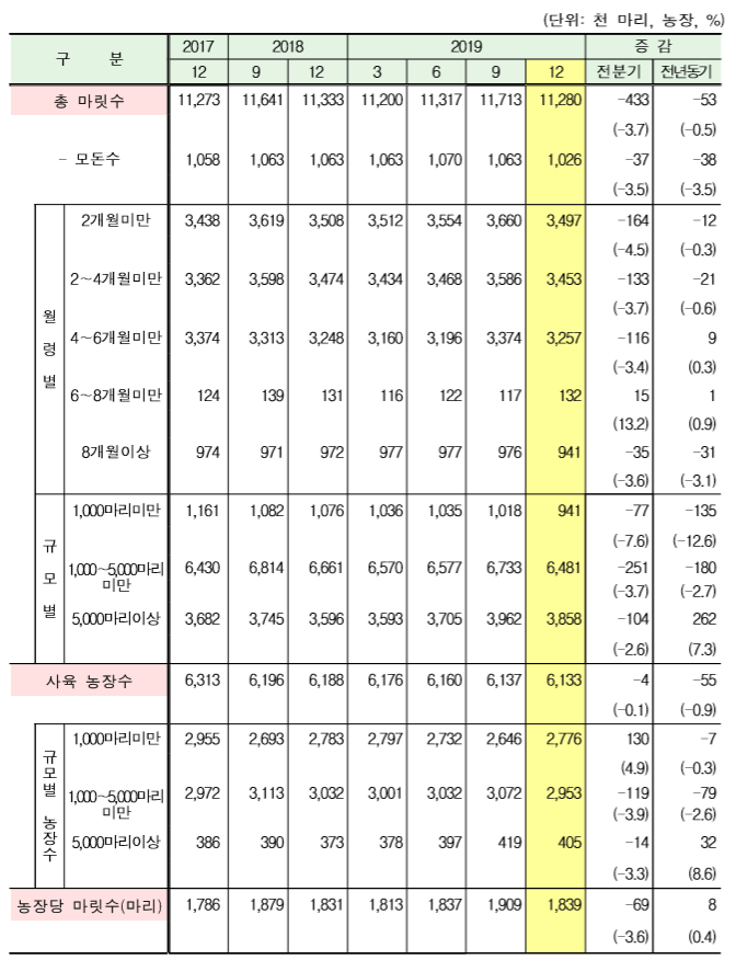 - 사육 마릿수(천 마리): (´18.12) 11,333 → (´19.9) 11,713 → (´19.12) 11,280