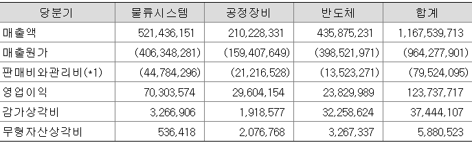 주요 사업별 부문은 물류시스템, 공정장비, 반도체 3부문으로 나눌 수 있습니다. (3분기까지 기준 매출)