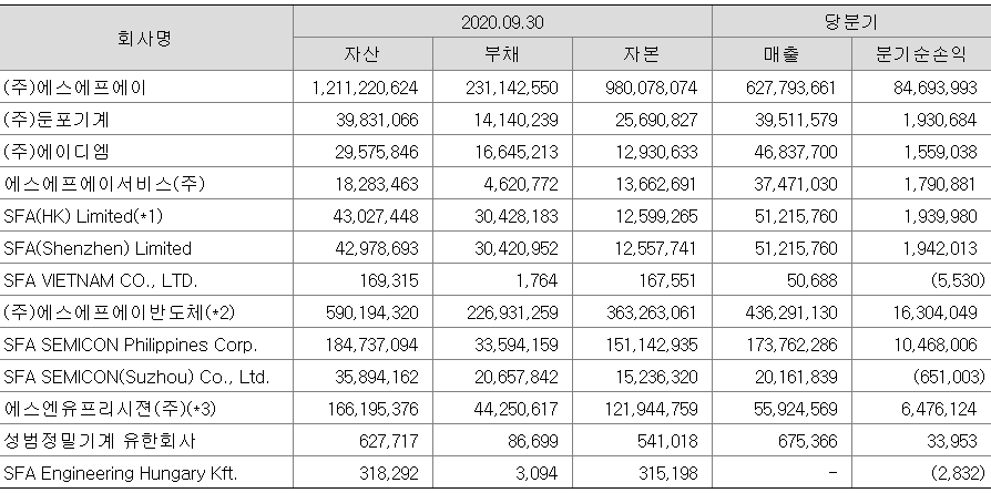 에스에프에이의 지배기업과 종속기업(이하 "연결회사")의 재무현황은 표와 같습니다. 에스에프에스와 에스에프에스반도체가 전체 매출액의 80% 비중을 차지하고 있습니다.
