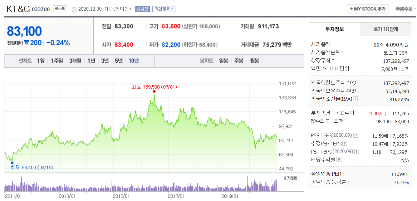 전년 태풍 및 긴 장마로 인하여 인상 및 담배 농사의 영향으로 원가의 상승이 예상되지만, 코로나로 인하여 건강에 대한 니즈가 높고 해외 한국산 인삼제품의 높은 인기로 인하여 매출액이 꾸준히 증가하고 있습니다. 30%대 높은 영업이익률을 바탕으로 지속적인 투자를 병행하고 있고 케이티앤지(KT&G)는 장기 투자로 추천드리고 싶습니다.