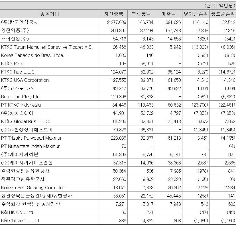 케이티앤지(KT&G) 지배기업은 담배제조 및 판매업을 주요 사업으로 영위하고 있습니다. 지배기업은 담배제조를 위한 신탄진공장 외 2개의 제조공장, 제조담배 판매를 위한 14개의 지역본부와 123개의 지(사)점, 잎담배가공을 위한 김천공장 및 포장지제조를 위한 천안공장등을 가지고 있으며, 본점소재지는 대전 대덕구 벚꽃길 71입니다. 2002년 12월 27일자로 지배기업의 상호를 주식회사 한국담배인삼공사에서 주식회사 케이티앤지로 변경하였습니다.