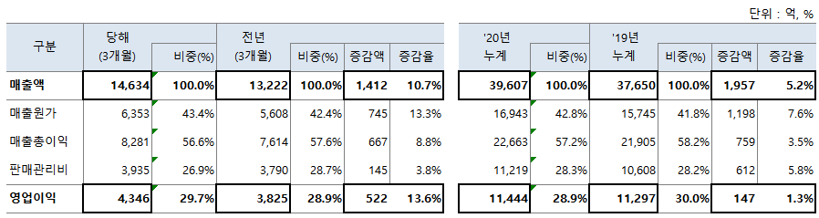 인삼사업 부문의 매출액은 12,418억, 영업이익 1,762억(영업이익률 14.2%) 규모의 경제가 요구되는 자본집약적인 산업으로서, 원료의 조달까지 6년간의 숙 성기간을 필요로 하는 등 자본의 회임기간이 길고 대규모 설비와 전국적인 유통망 구축 및 마케팅비용이 수반되어 진입장벽이 높은 산업이라고 볼 수 있습니다. '정관장' 브랜드를 중심으로 한 유통망 확장으로 수요기반을 공고히 하고 지속적인 신제품 개 발 등 고객지향 마케팅 판촉을 시행하고 있으며, 2020년 당분기말 현재 총매출의 약 91.3%를 차지하고 있습니다.