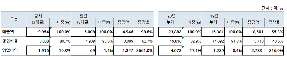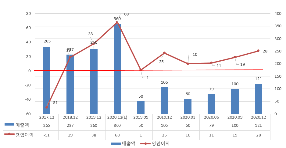 '20년 9월 누계 매출액은 289억으로 전년대비 +85억 +55.3% 성장하였고 영업이익은 41억으로 전년비 +28억 +216.0% 개선하였습니다. 여기서 영업 비용은 외주비(개발비?) +99억 증가하였습니다. 4분기를 소극적 반영할 경우 '20년 누계 예상 매출액은 360억으로 전년비 +100억 +39.0%, 영업이익은 68억으로 +30억 78.9% 개선하였습니다. 중요한 것은 19년 경영지표 부채율이 19.07%, 당좌비율 601.21%, PER(배) 19.8로 아주 건실한 기업이었으며 올해는 더욱 좋아질 것으로 판단됩니다.