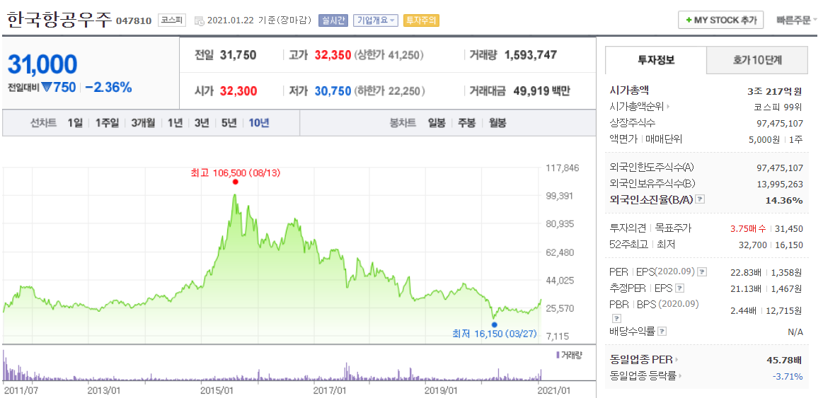 전문가들은 한국항공우주에 대해 코로나19 백신 기대에 따른 항공제조 산업 전반의 회복 기대가 반영될 것이라고 분석하고 있습니다. 항공기, 우주선 등을 설계, 제조, 판매하는 한국항공우주에 대해 4분기 매출액 7,490억, 영업이익은 254억 원의 실적을 올릴 것으로 예상하였습니다. 부채율(%)은 269% 조금 높고 당좌비율(%) 58% 낮으며, PER(배) 21.13 으로 보통입니다. 배당율을 400원으로 1~2% 지급하고 있습니다.