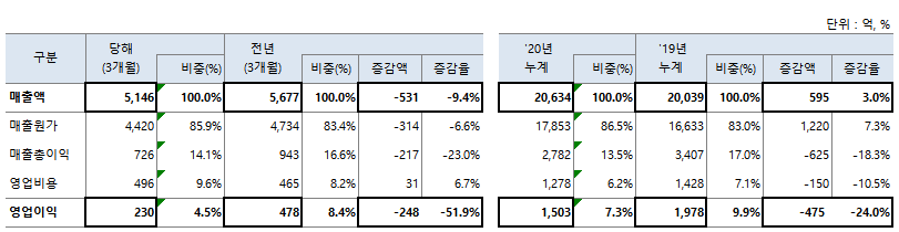 '20년 9월 누계 매출액은 2조 634억으로 전년비 595억, +3.0% 성장하였고, 영업이익은 1,503억으로 전년비 -475억 -24.0% 감소하였습니다. 매출이익액을 분석하면 매출요인으로 +101억 개선, 원가 인상으로 GP요인은 -726억 감소하였습니다. 그리고 판관비 중 경상개발비 중심으로 -150억 감소하였습니다.