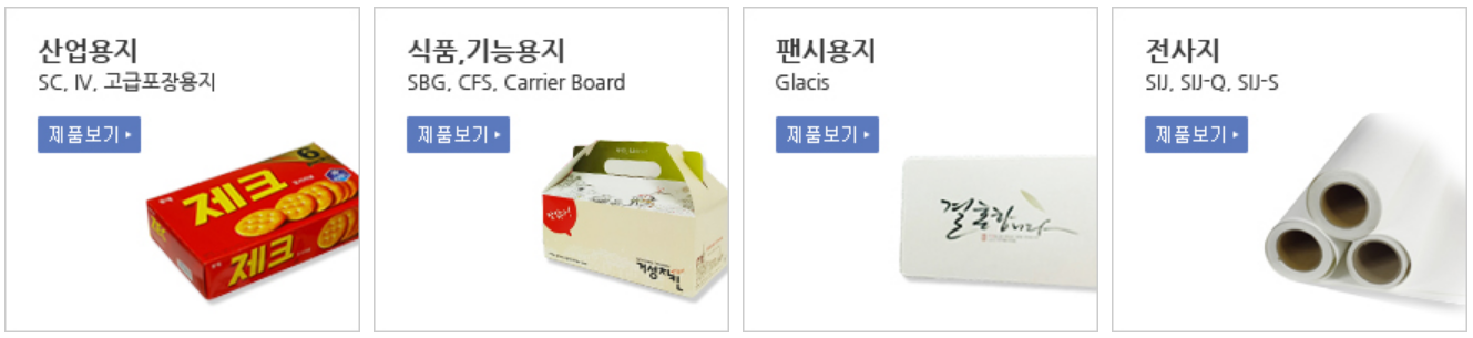 SBG는 High bulk all pulp 제품입니다. 무형광 제품으로 식품 포장용으로 가능합니다. 두께 특성이 우수하고 양호한 제함적성을 가진 고급 포장재입니다. KLB는 100% 미표백 펄프를 사용하여 자연 친화적입니다. 100% UKP 제품으로 식품 포장용으로 가능 합니다. 친환경적이며 강도가 우수한 제품 입니다. CFS는 친환경적이며 과채류 신선도 유지 및 결로현상을 억제 합니다. 원지 후면에 특수코팅을 통하여 농산물의 신선도를 유지시키는 제품입니다. 농산물 박스 합지용으로 사용, 에틸렌가스, 수분등을 코팅층에 흡착시켜 농산물 부패를 지연 시켜줍니다.
