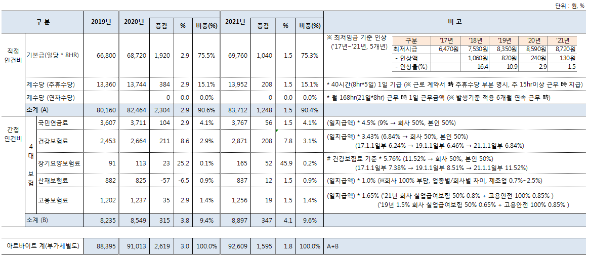 그래서 '21년에 아르바이트 일당을 계산하면 '21년 8,720원 * 8hr = 69,760원 기본으로 주휴수당 13,952원을 받을수 있습니다. 따라서 기본급과 주휴수당을 합하면 83,712원을 받아야 합니다.
