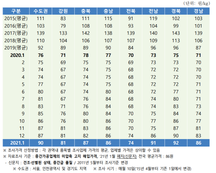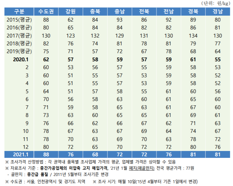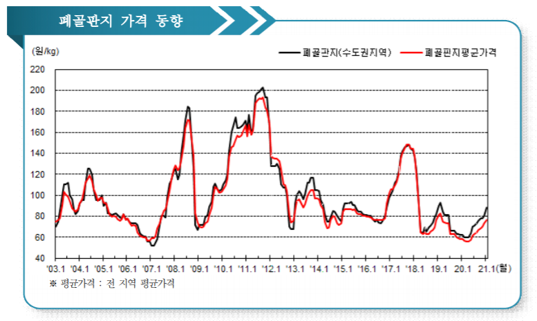 '21년 1월 조사일(10일) 기준 국내 폐지 가격은 폐신문지 가격은 전월대비 +2원 오른 전국평균 86원대(가격은 kg단위 기준이며 본 조사 에서 공표하는 23개 품목의 가격에서 모두 동일하게 적용됨) 형성하였습니다. 그리고 폐골판지 가격은 전월대비 4원 오른 전국평균 77원대 형성하였습니다.