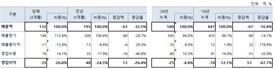 '20년 9월 누계 매출액은 580억으로 전년비 -67억, 10.4% 역성하였고 주요 업제는 현대위아(주) 312억, 한화디펜스(주) 57억 전체 매출을 차지하고 있습니다. 영업이익은 -25억으로 전년비 +53억을 개선하였습니다. 주요 원인은 매출원가 인하 및 판매관리비 절감입니다.