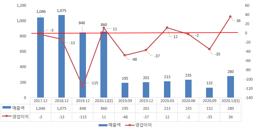 2020년 매출액은 860억으로 전년비 +12억, +1.4% 성장, 영업이익은 11억으로 전년비 +126억 개선할 것으로 예상됩니다. '19년 매출 감소와 3년 연속 영업이익 적자는 흑자전환의 원년이 될 것으로 판단됩니다.