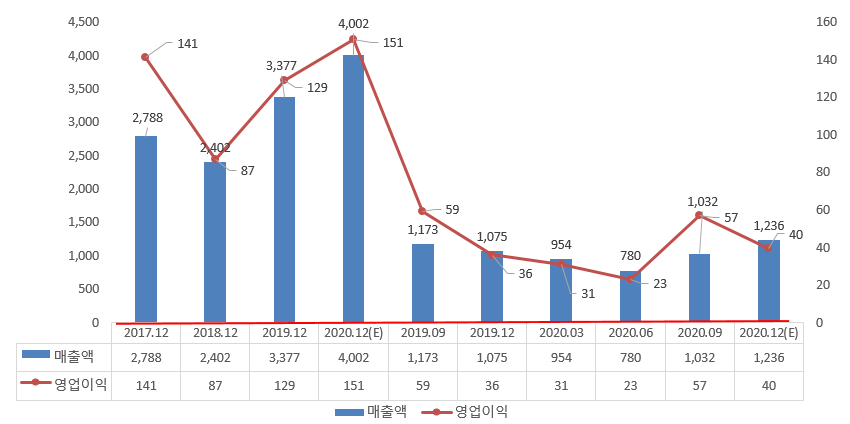'20년 예상 매출액은 4,002억으로 +625억 18.5% 증가 하였고 영업이익은 +151억으로 전년비 +22억 개선하였습니다.