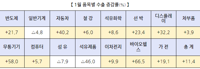 21년 1월 주요 수출품목 증감률을 보면 반도체 +21.7%, 자동차 +40.2%, 바이오헬스 +66.5%, 그리고 무선통신기기는 무려 +58.0%로 증가였습니다.