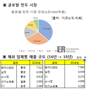 세계만두 시장 규모는 5조 7,000억월('18년기준)넘어 지속적으로 성장하고 있으며 CJ는 각국 식품업체는 인수을 통해 '20년 매출액 1조를 넘었습니다.