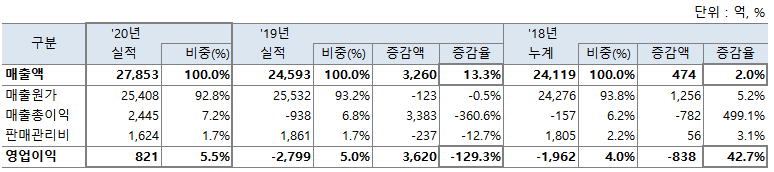 '20년 27,853억으로 전년비 +3,26억으로 13.3% 성장하였고 영업이익은 821억으로 전년비 +3,620억 개선하였습니다. 이는 매출증가로 +456억이 개선되었고 매익률(GP) +2,927억, 판매관리비 +237억 개선하였습니다.