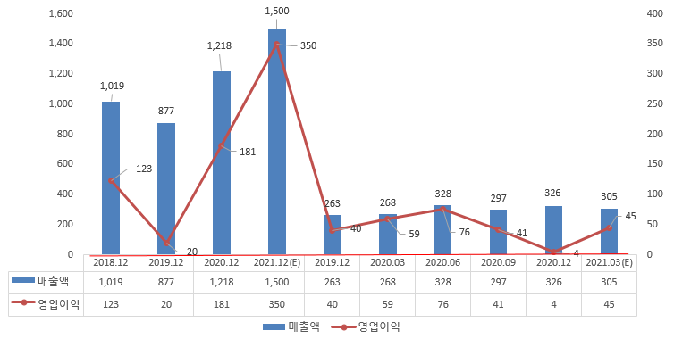 '21년은 매출은 1,500억으로 전년비 +23.2% 성장하고 영업이익은 350억으로 +169억하는 성과를 이룰 것으로 예상합니다.