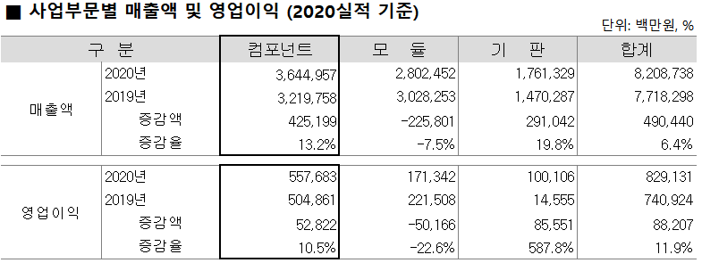 '20년 사업부문별 실적을 보면 MLCC가 포함되어 있는 컴포넌트사업부문의 매출액 36,449억으로 전체 매출액의 45.5% 차지하고 있으며 영업이익은 5,577억으로 전체 67.3% 비중을 차지하며 삼성전기를 이끌어가고 있습니다.