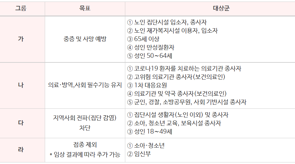 접종순서는 목적에 따라서 위와 같으며, 접종순서 국내 유행상황, 백신의 공급 시기 및 물량 등을 고려하여 예방접종전문위원회 심의 후 조정 후 수시로 조정하고 있습니다.