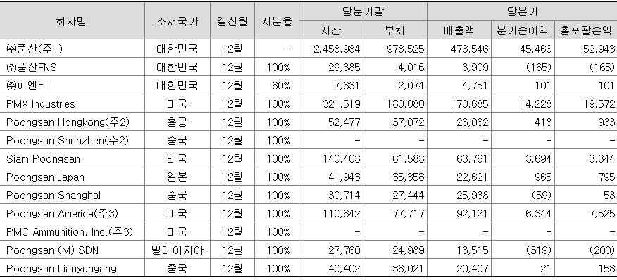 주식회사 풍산(이하 "지배기업")은 주식회사 풍산홀딩스의 제조사업부문을 승계하여 2008년 7월 30일에 주식을 한국거래소에 재상장하였습니다. 지배기업은 울산 및 부산 등 4개 공장에서 동 및 동 관련 제품의 제조 및 판매 등을 하고 있습니다. 지배기업의 최대 주주는 주식회사 풍산홀딩스이며, 당기말 현재 지분율은 38.00%입니다.