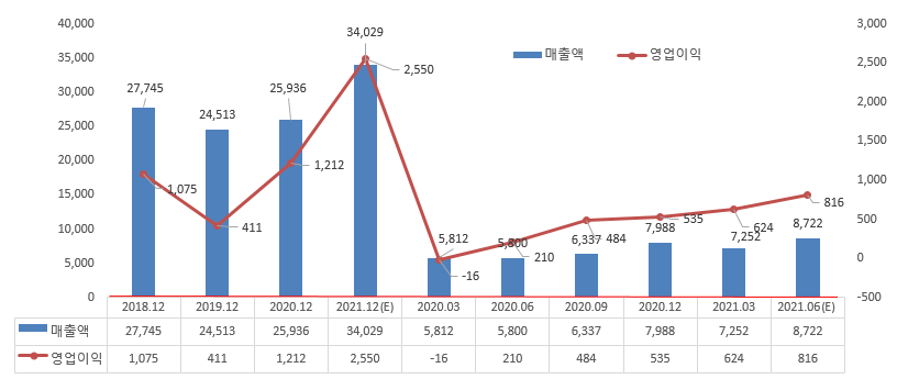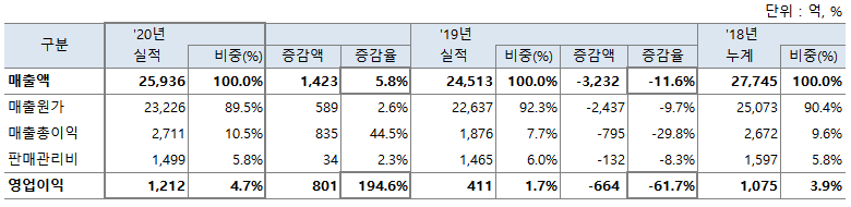 20년에는 매출액 25,936억으로 전년비 +1,423억 +5.8% 개선하였고 영어이익은 1,212억으로 전년비 +801억 개선을 하는 성과를 이루었습니다.