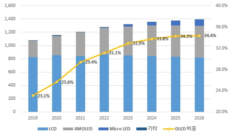 Omdia와 한국디스플레이산업협회(KDIA)에 따르면 2021년 세계 디스플레이 시장규모는 전년 대비 4.33% 성장한 1,205억 달러 규모의 시장을 형성할 것으로 예상되고, 2026년에는 1,390억 달러 규 모로 성장할 것으로 예상됩니다. 동기간 전체 디스플레이 중 LCD의 비중은 70%에서 58% 수준으로 감소할 것으로 예상되는 반면, OLED 비중은 29%에서 34% 수준으로 증가할 것으로 예상됩니다.
