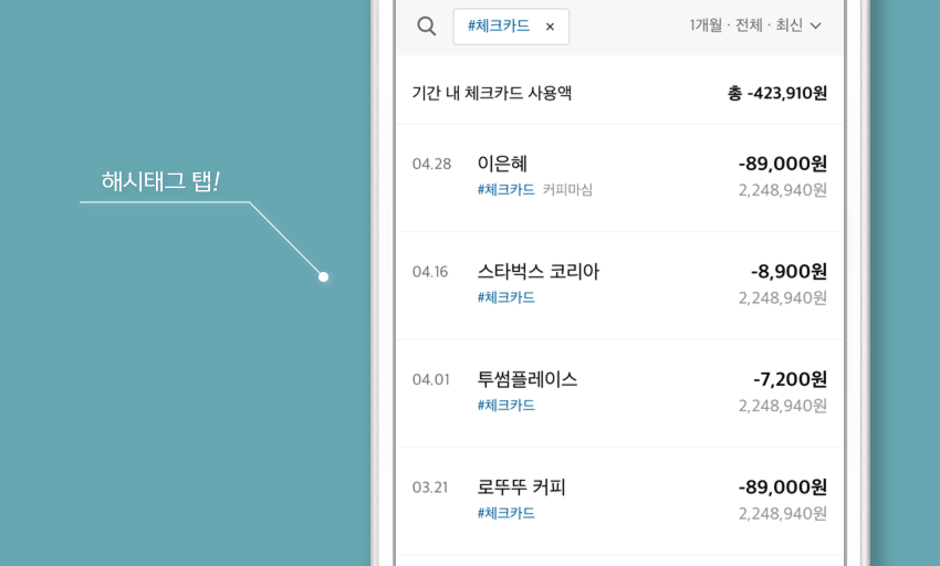 #해시태그를 통해 자동이체, 현금출금 등 주요 거래들을 종류별로 모아서 쉽게 확인할 수 있어요.