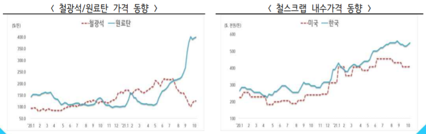 -. 철광석은 중국 불확실성 및 Rio Tinto 출하감소에도 거래량 꾸준히 지속되어 강보합세입니다. 원료탄은 공급부족 우려에도 중국의 수요강세로 역대 최고수준 가격강세 지속되고 있습니다. 철스크랩은 미국산 보합에도 일본(10.5%), 중국(2.6%), 한국(4.0%) 등 동아시아 지역 상승세 이여가고 있습니다.